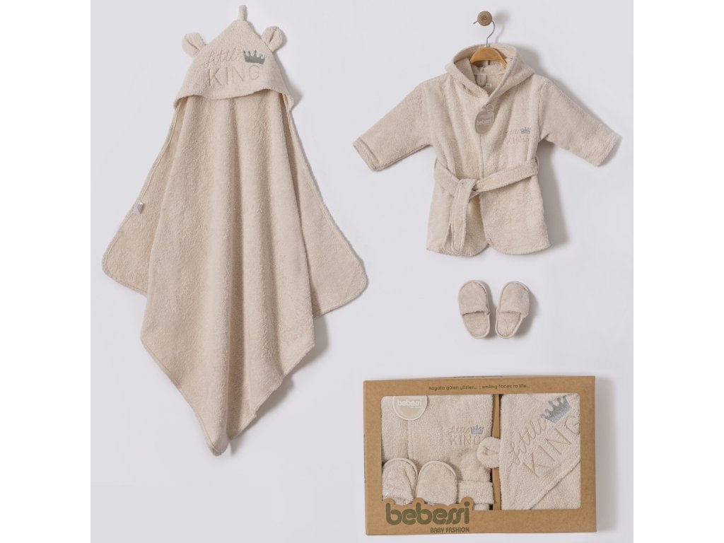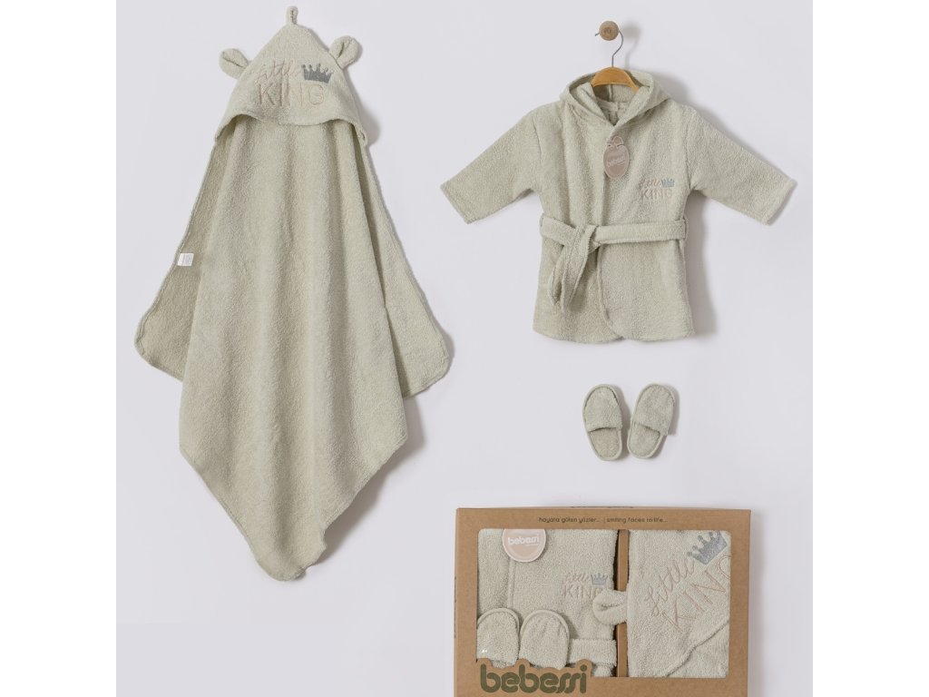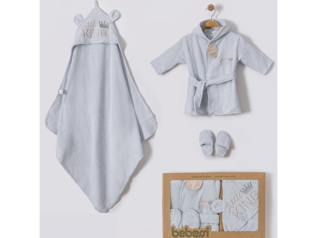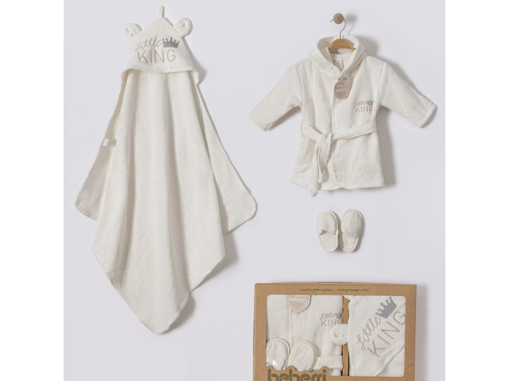 Příjemné, výšivka Little King, kapuca dobře zahřeje hlavičku miminka po koupeli, pásek na převázání.