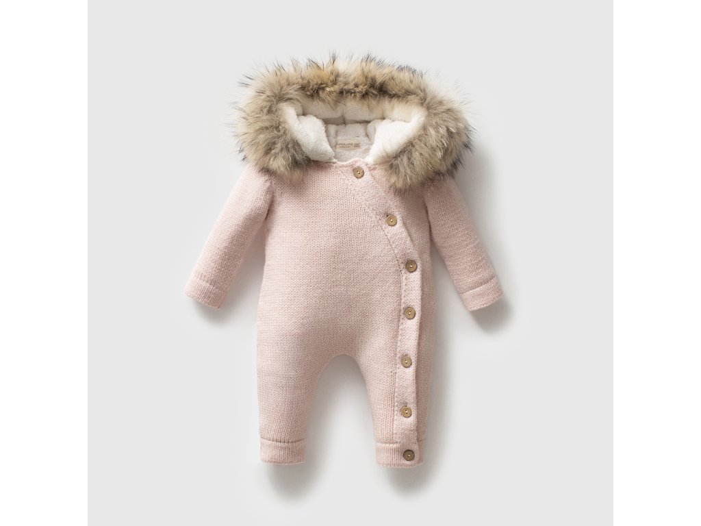 Tato krásná kombinéza v růžové barvě s kapucí z jemného úpletu upoutá pozornost.