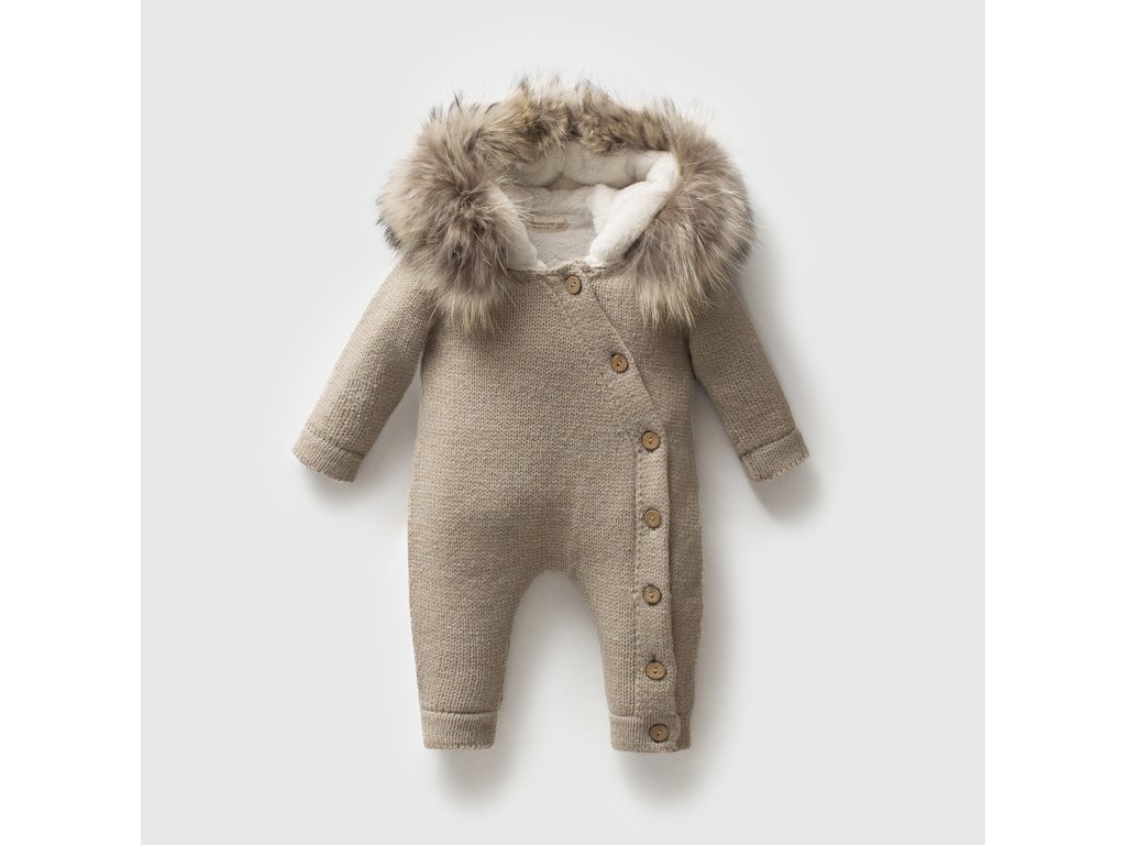 Tato krásná kombinéza v kamenné barvě s kapucí z jemného úpletu upoutá pozornost.