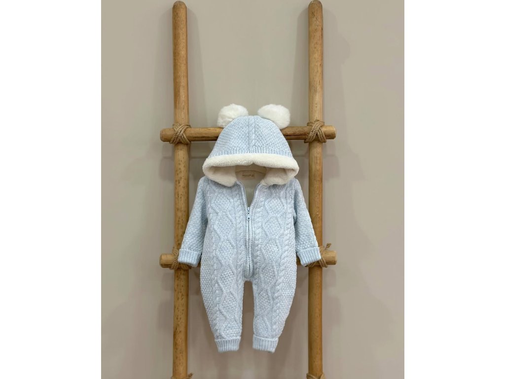 ato krásná kombinéza v modré barvě s kapucí z jemného úpletu upoutá pozornost.