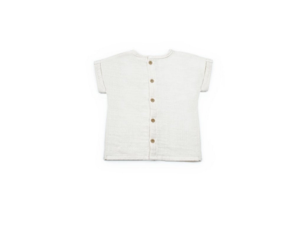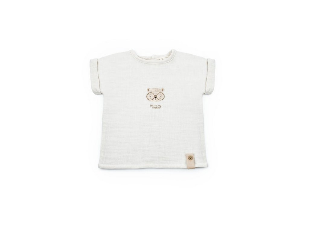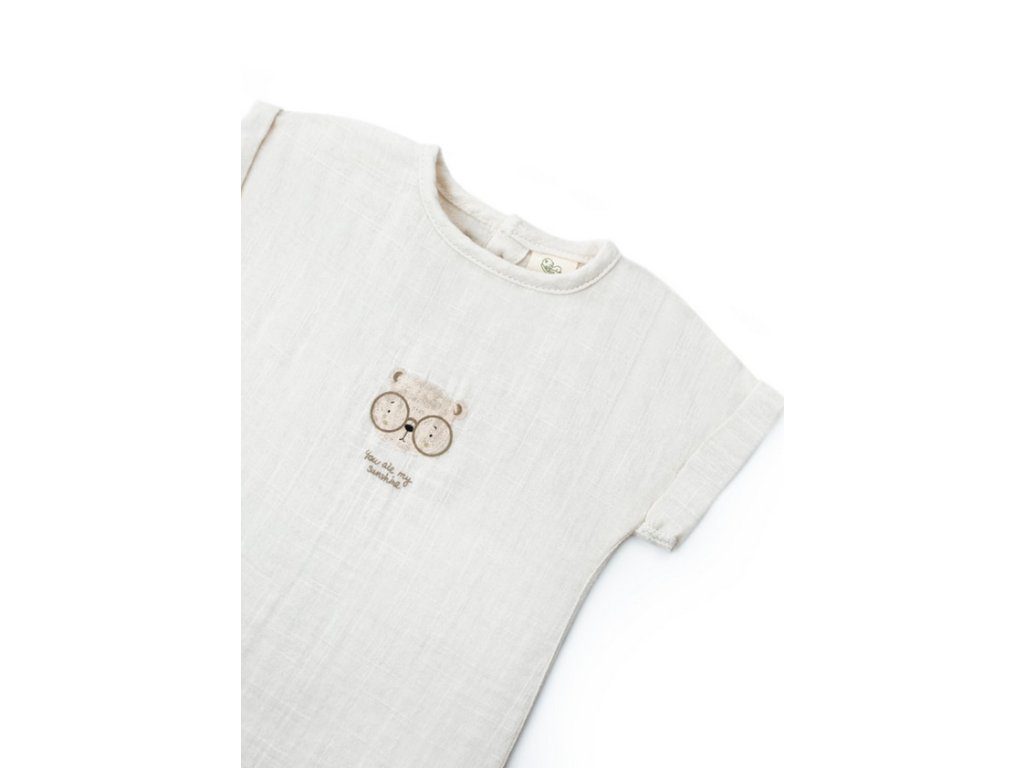 Mušelínové tričko s krátkým rukávem, potiskem medvídka a knoflíky. Kraťasy s kapsami a stahovací gumou v pase.