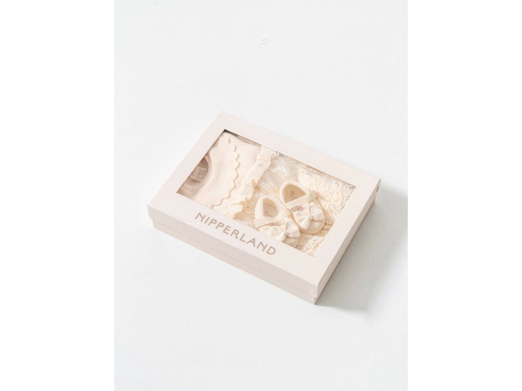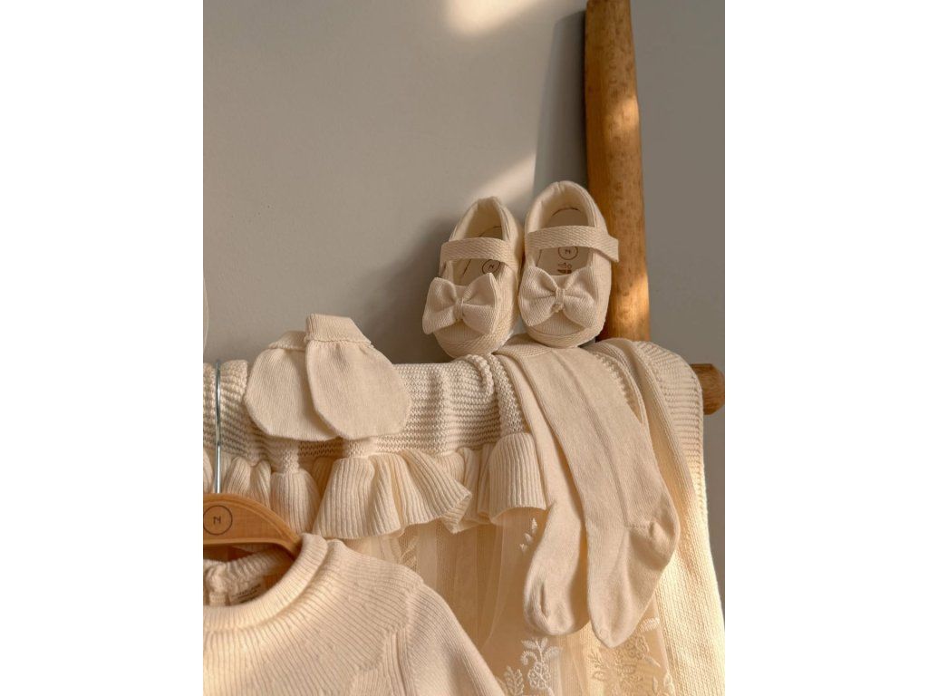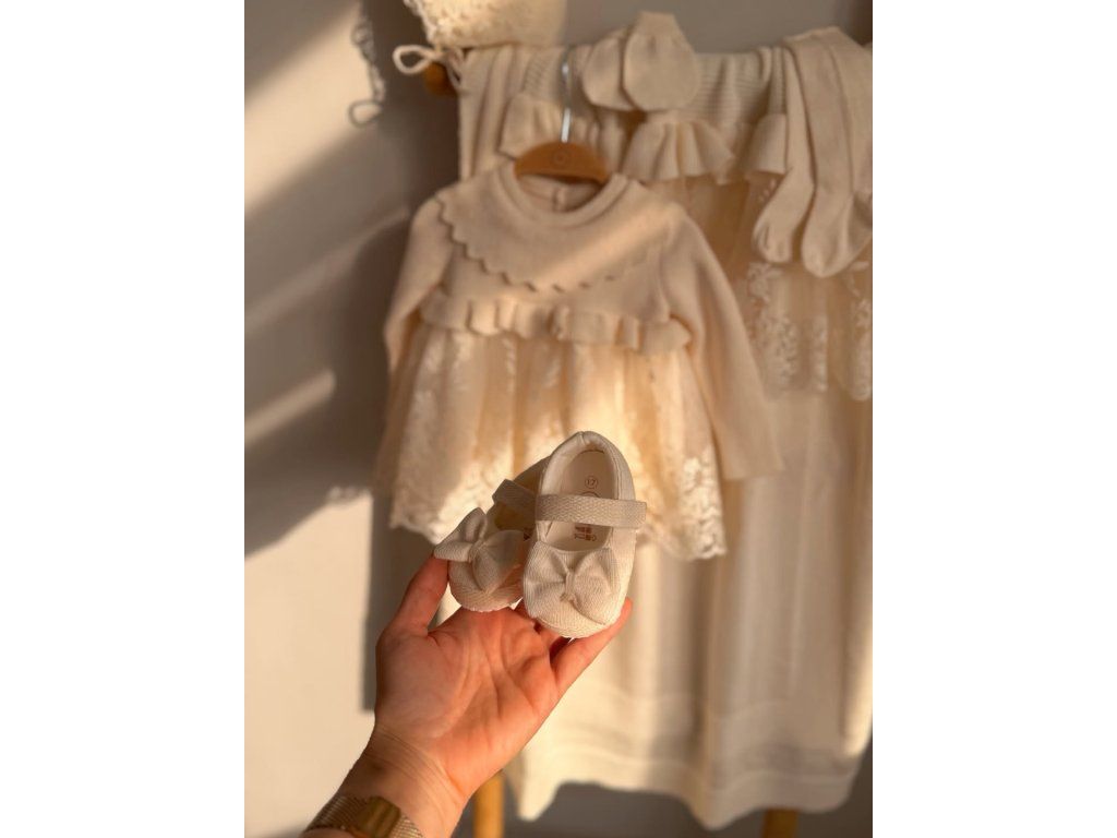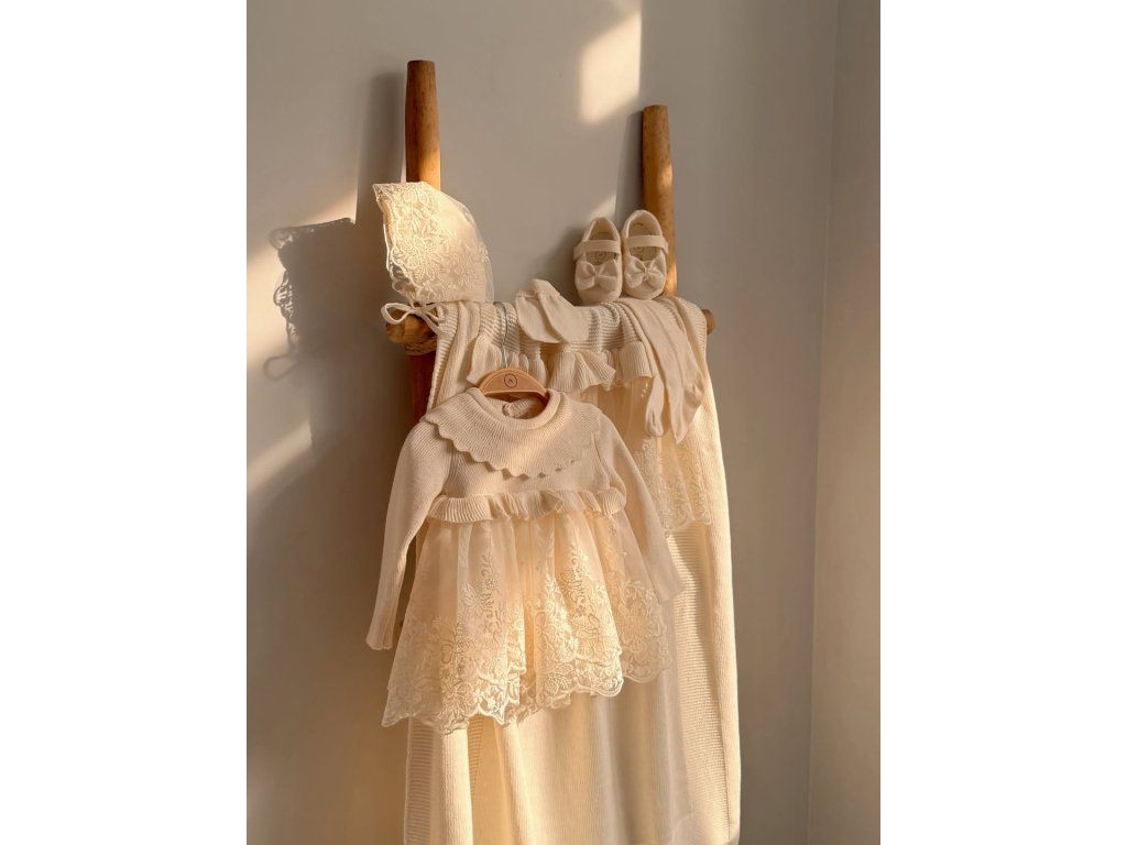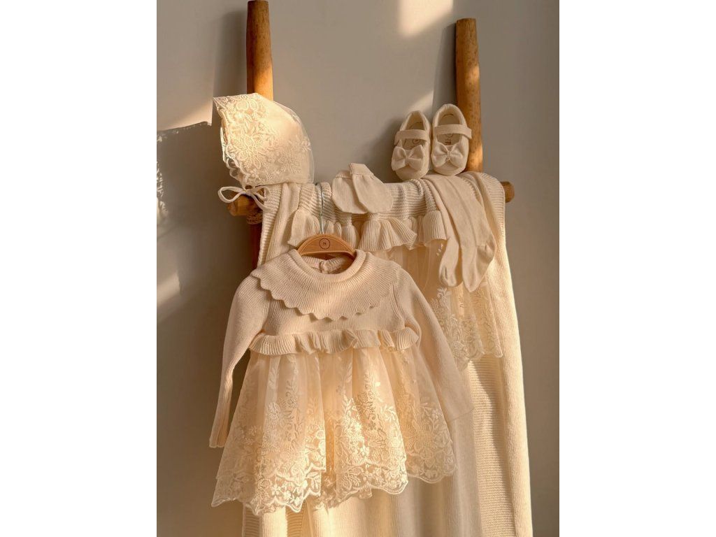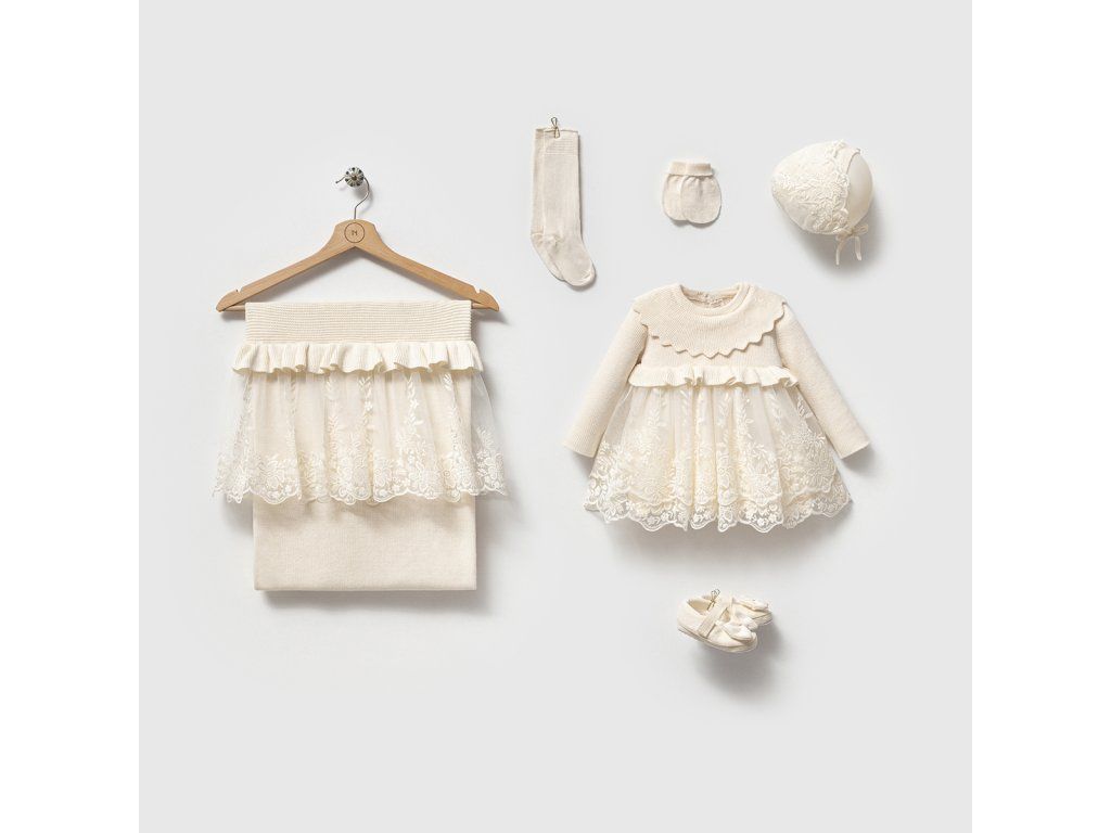 Tento luxusní novorozenecký set se skládá celkem z šesti dílů - šatičky, botičky, čepička,podkolenky, palčáky a dečka.