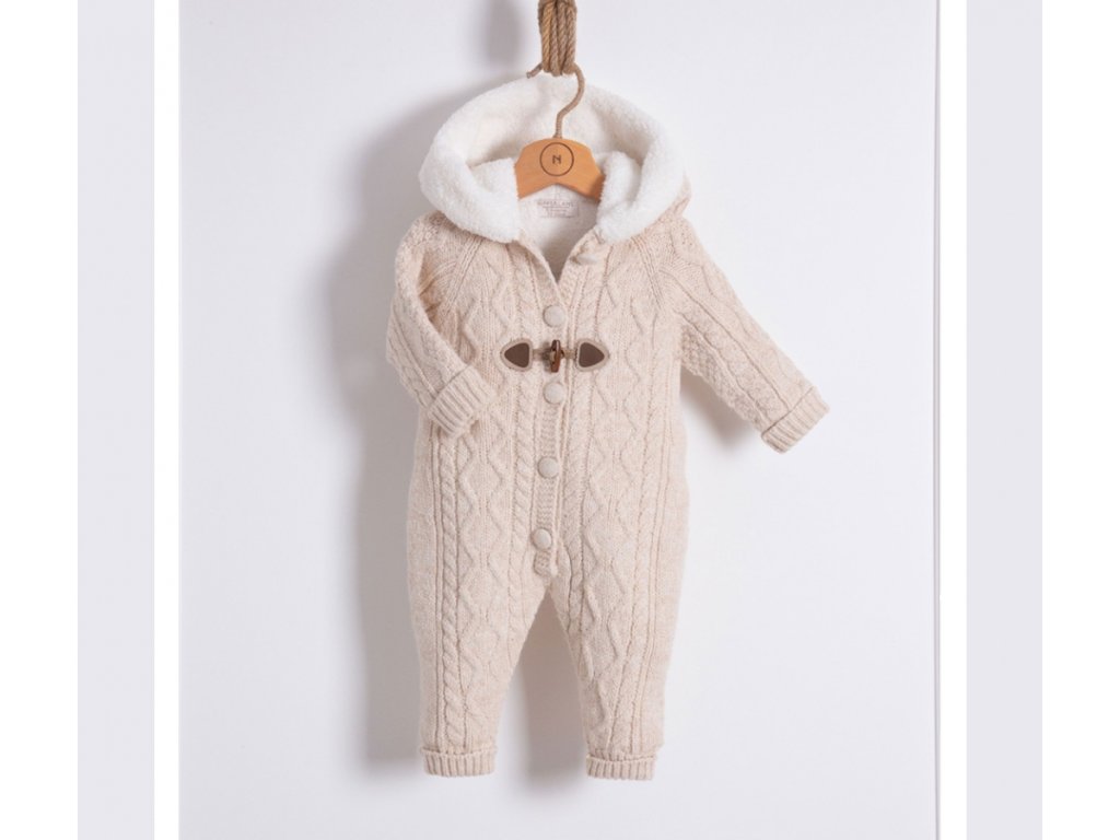 Tato krásná kombinéza v béžové barvě s kapucí z jemného úpletu upoutá pozornost.