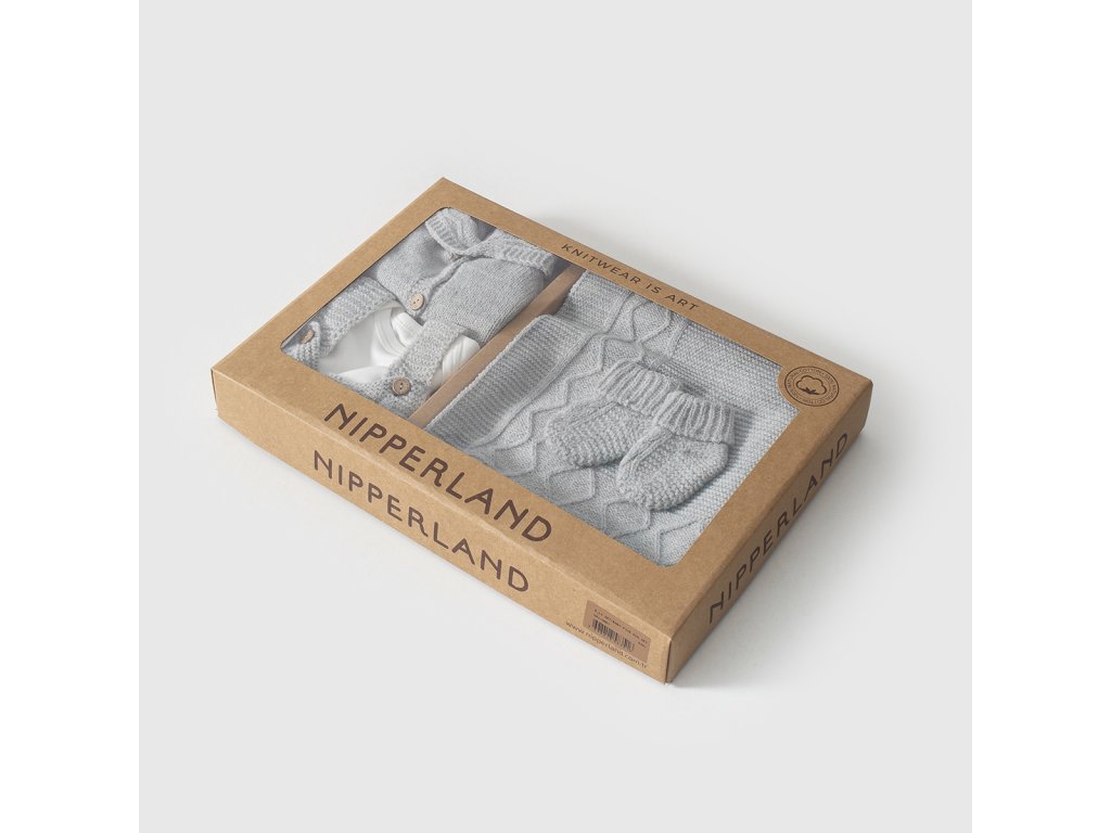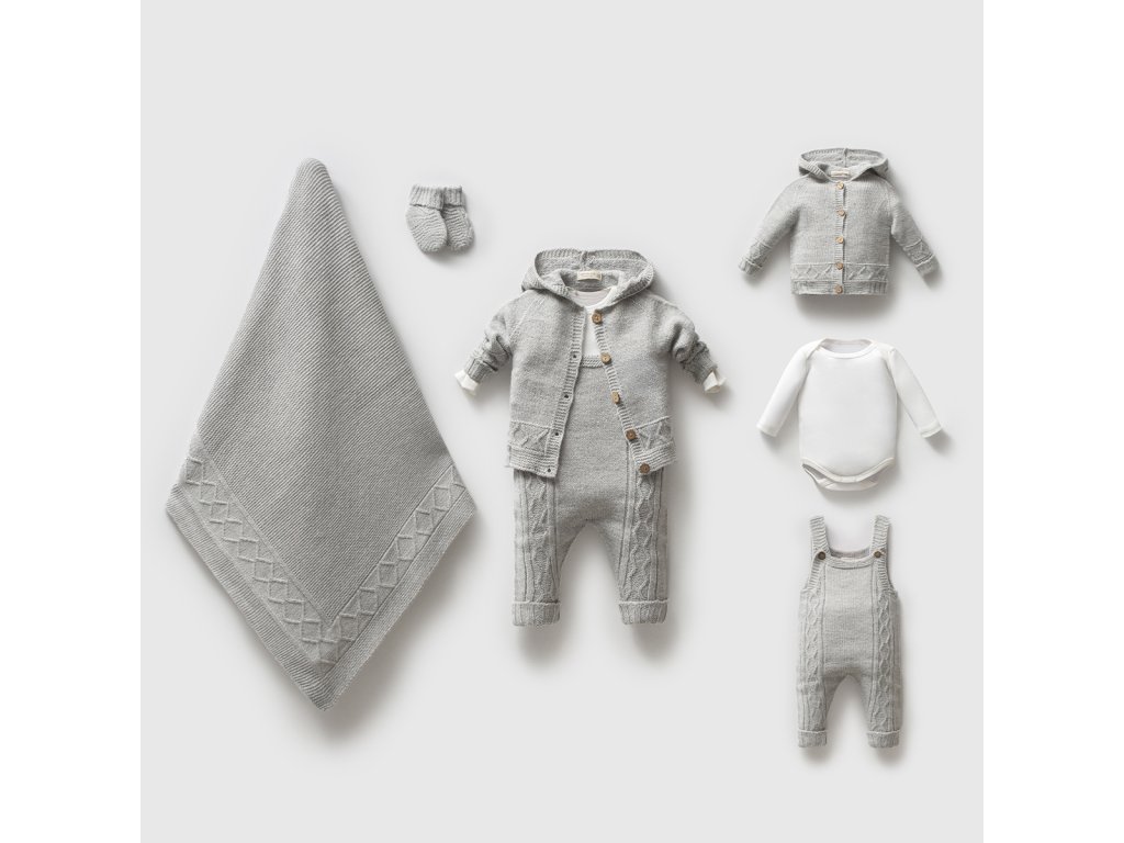 Tento nádherný set se skládá z body s dlouhým rukávem, pleteného overálku, svetříku, dečky a pletené capačky. Je k dispozici v šedé barvě. Pletený svetr má vpředu velmi decentní copánkový vzor. Lano je vyrobeno z jemné a měkké příze a nepoškrábe jemnou pokožku vašeho miminka. Tato sada vás přesvědčí svou kvalitou a pohodlím.