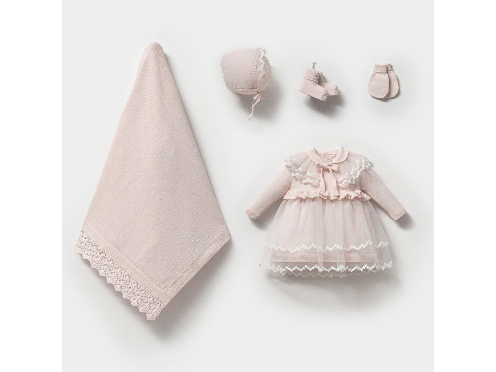 Tento luxusní novorozenecký set se skládá celkem z pěti dílů - šatičky, botičky, čepička, palčáky a dečka.
